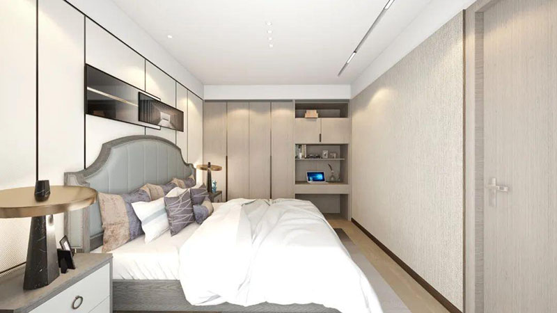 ▲主臥的棕色護墻板與白色家具,形成拼接體系,同色系相互對應,結合溫柔的軟裝搭配,使整個臥室都沉浸在溫馨柔和的氛圍內。