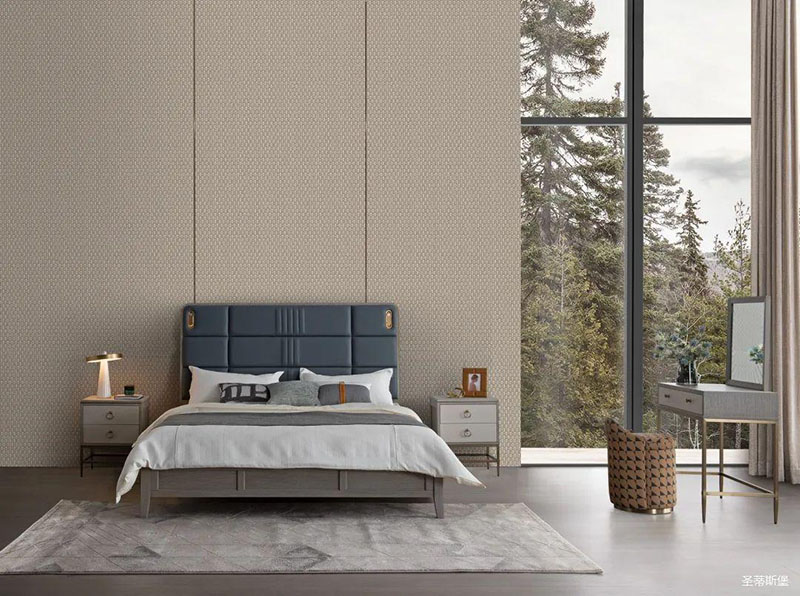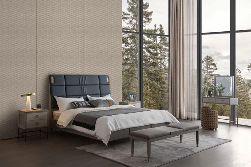 主臥擁有貼近自然的魔力,藍色床屏色彩與外界的自然綠相互吸引,凹凸的線性塊狀軟包設(shè)計,線條輕盈又流暢,打造了臥室背景強烈的立體感,金屬包裹的感應(yīng)小夜燈,守護你的每個夜晚,令睡眠更具安全感。