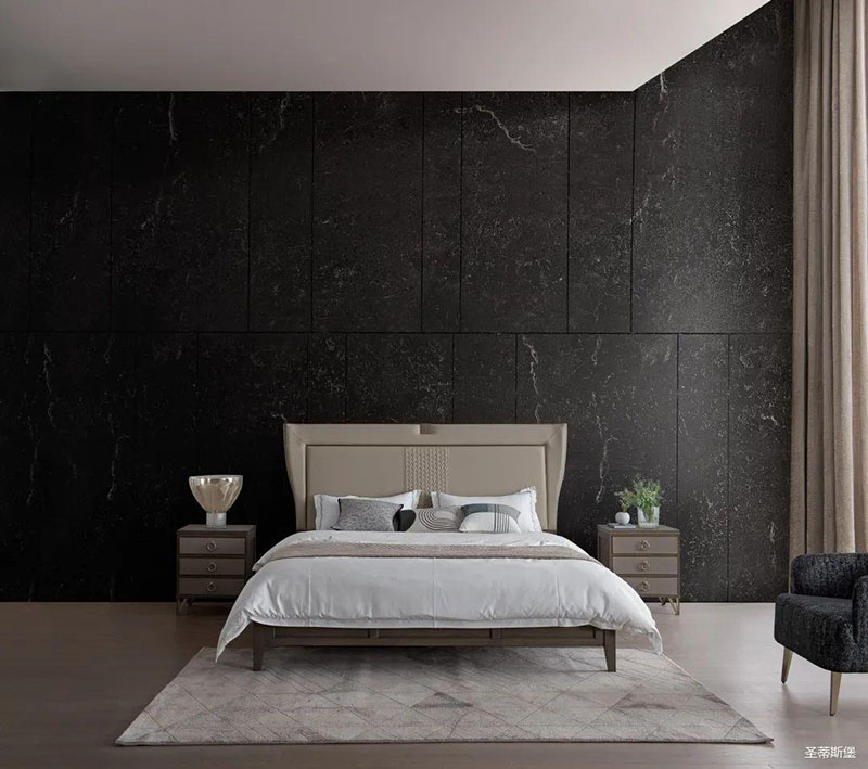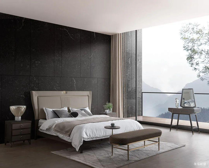 次臥床頭背景沿用了暗色大理石護墻,空間層次分明,簡約時尚的米色床屏糅合金屬鑲嵌與真皮編織藝術(shù),看似舒適隨意,卻在極簡中透著淡淡的奢華感。大面積的落地窗讓自然光傾入室內(nèi),拉上與床屏同色系的窗簾,令次臥的室內(nèi)空間明暗有度。