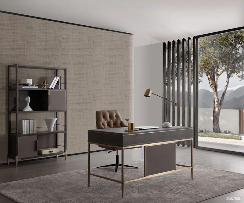 沉靜雅致的書房空間,溫潤實木與硬朗金屬線條相互配合,運用基礎(chǔ)幾何,打造空間的高級感。輕奢質(zhì)感緩緩流淌,書籍整齊,擺件精致,無一不追求著精致細節(jié)與極致的品味,營造出時尚與沉穩(wěn)并列的氛圍,詮釋著居者對是生活環(huán)境的內(nèi)在追求。
