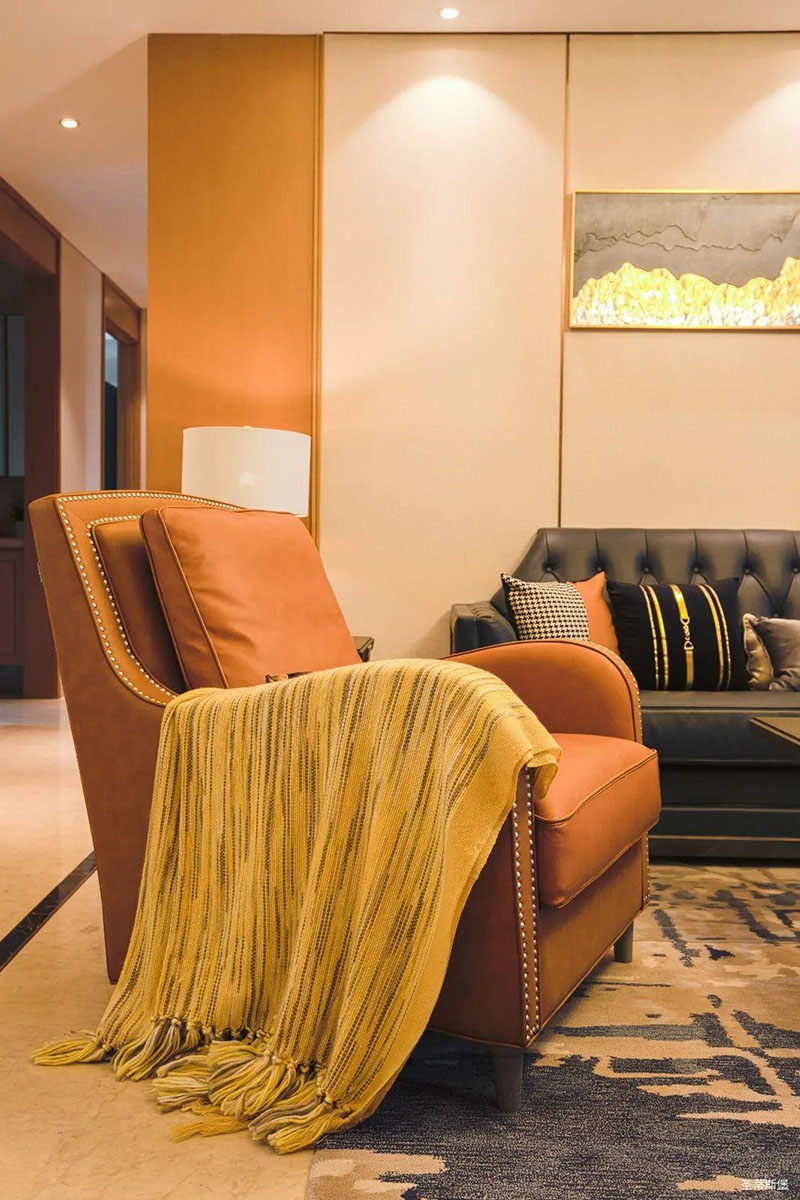 愛馬仕橙的休閑椅是空間的點(diǎn)睛之筆,相對(duì)于霸氣沉穩(wěn)的墨綠雙人沙發(fā),它更為時(shí)尚摩登,兩者合理搭配,賦予了空間陽剛與柔情并存的意境。