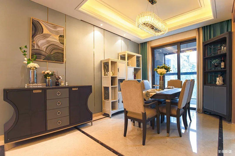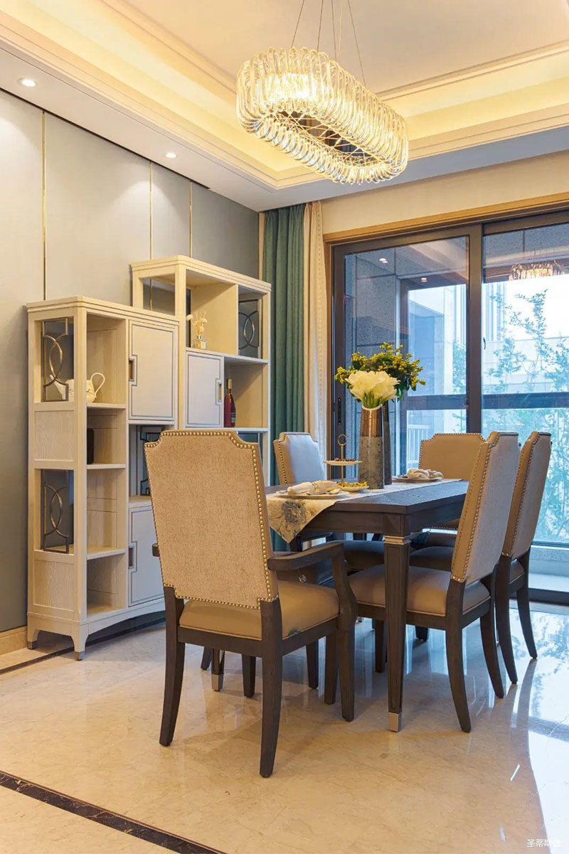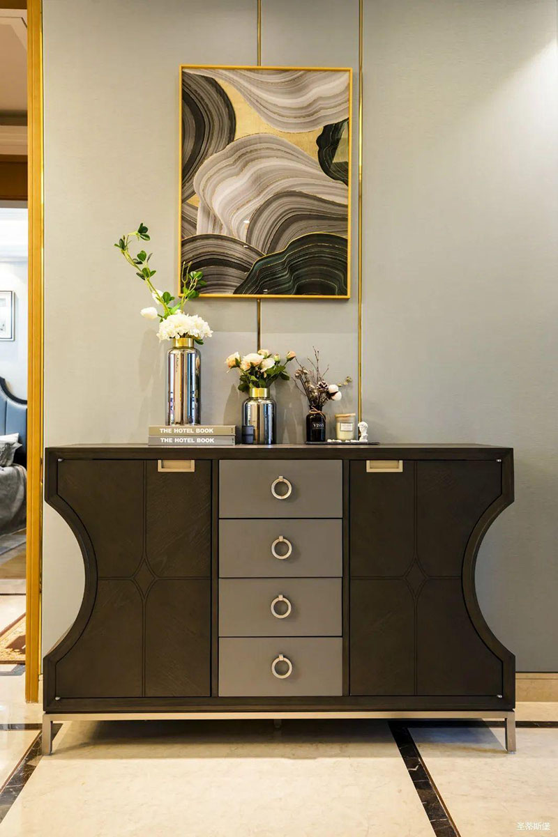 米白色餐邊柜坐落餐廳一角,簡(jiǎn)約沿框線條,層次分明。金屬半圓與實(shí)木鑲嵌,盡顯優(yōu)雅輕奢的姿態(tài)。