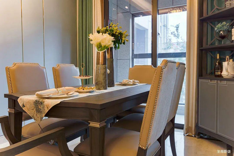 看似傳統(tǒng)實(shí)木的餐桌,細(xì)節(jié)之處卻盡顯輕奢精致格調(diào),高級(jí)灰軟包,原金屬鉚釘嵌入,在體現(xiàn)時(shí)尚感的同時(shí),也提升了用餐的舒適度。