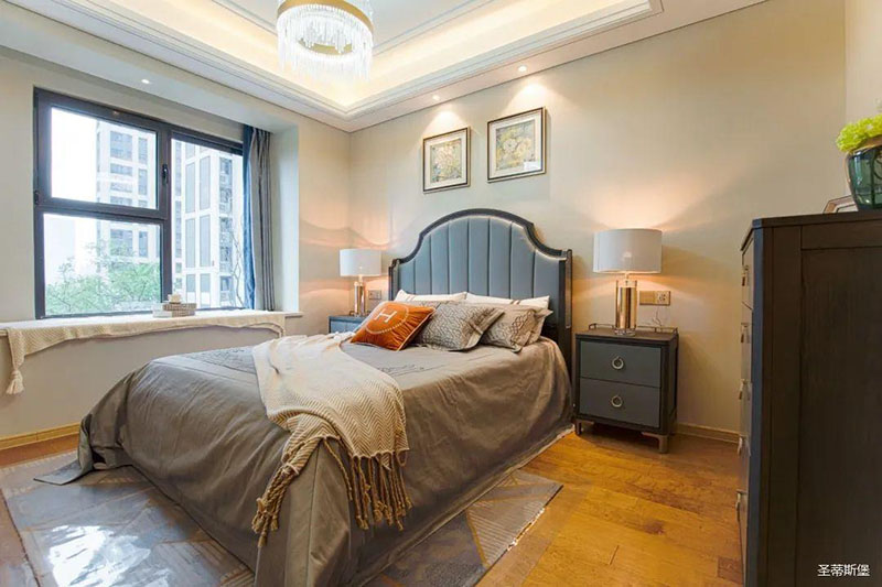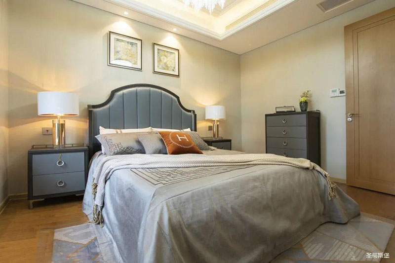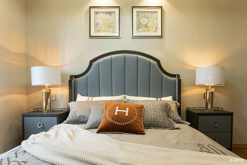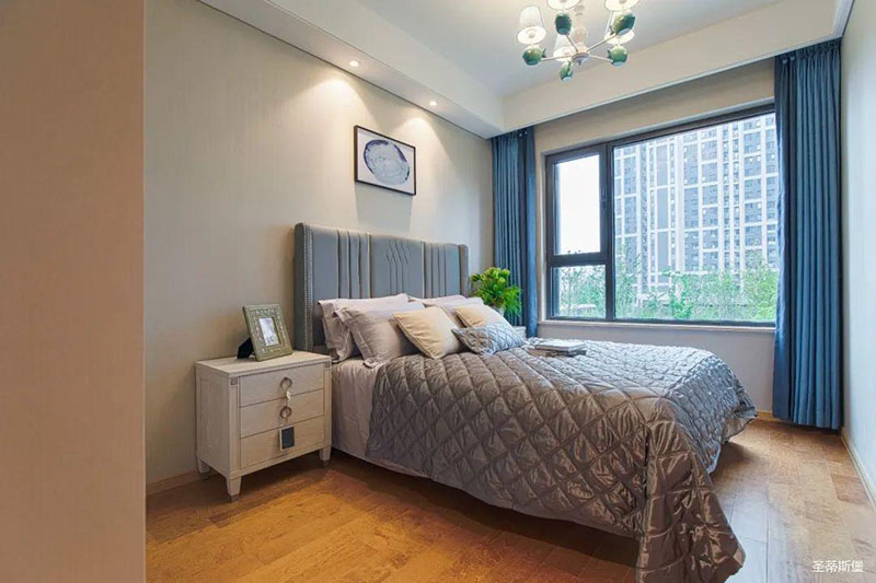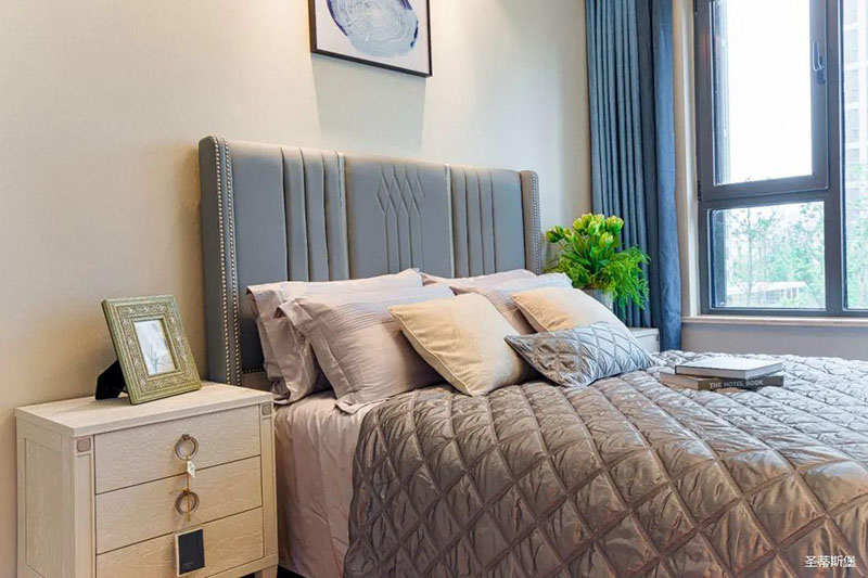 次臥高床屏由金屬鑲嵌,呈現(xiàn)簡(jiǎn)約有序的線條,霧霾藍(lán)床屏與淺藍(lán)朦朧裝飾畫,窗簾相呼應(yīng),色澤搭配和諧自然,無不透漏著一種簡(jiǎn)潔大方視覺體驗(yàn)。