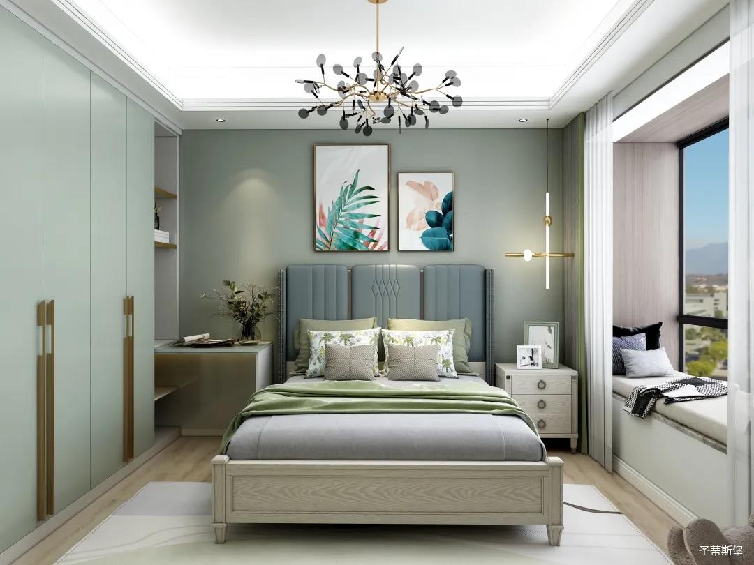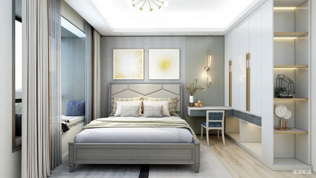 次臥的設計充滿治愈氣息,表姐打算讓兩位老人居住。莫蘭迪灰的實木感經(jīng)典再現(xiàn),沉穩(wěn)中透著時尚,流露出精致的美式格調(diào)。舍棄刻意繁復的設計,簡約米白背景墻與床屏產(chǎn)生的視覺延伸,提升了空間的舒展性。金屬材質(zhì)的燈飾,以較強的白熾燈為主,輔助照明,將對兩位老人的關愛體現(xiàn)在細節(jié)中。