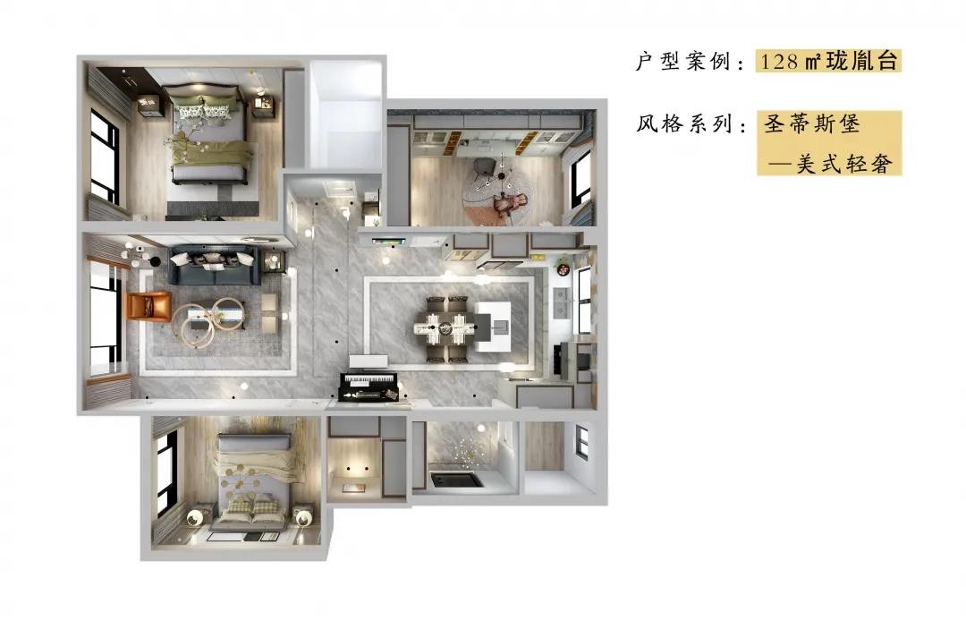 客廳延續(xù)著美式輕奢的氣韻,背景墻被簡約有序的金屬線條分割,營造出質(zhì)感空間的細(xì)膩。沙發(fā)沉穩(wěn)又不失時(shí)尚,色彩混搭更是讓人耳目一新,展現(xiàn)著美式風(fēng)格天性自由不羈的浪漫個(gè)性。