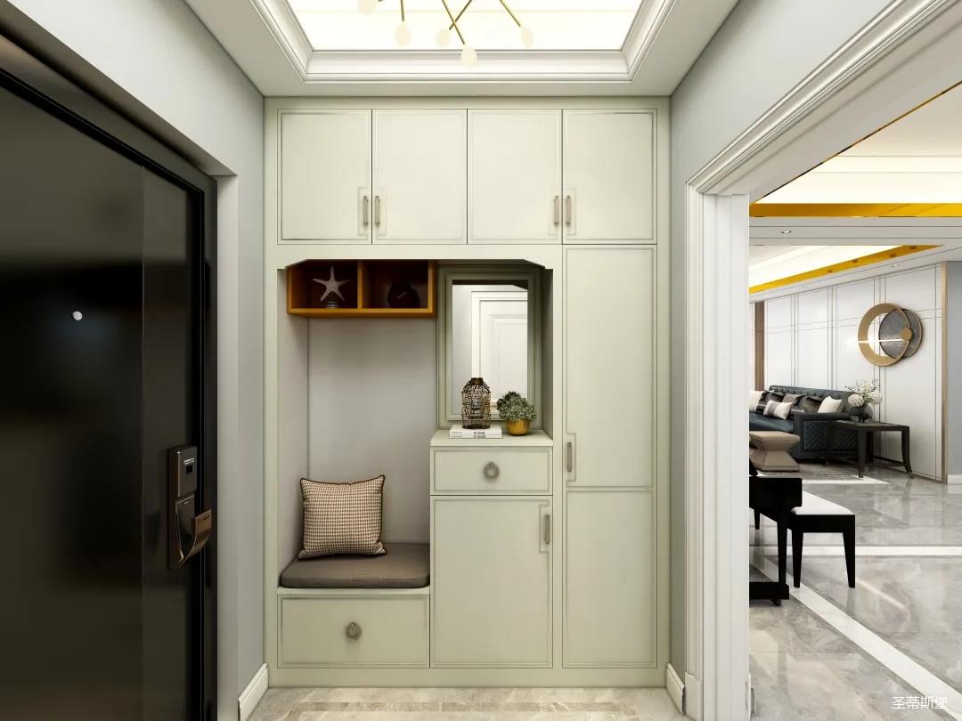 象牙白色調(diào)讓入室空間散發(fā)著溫柔的氣息,定制玄關(guān)柜上輕奢金屬線條的加持,洋溢著一種不加雕飾的美感,色澤素雅,紋理精致,于內(nèi)斂沉靜中,感受入戶空間的氣質(zhì)。