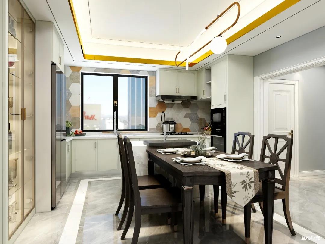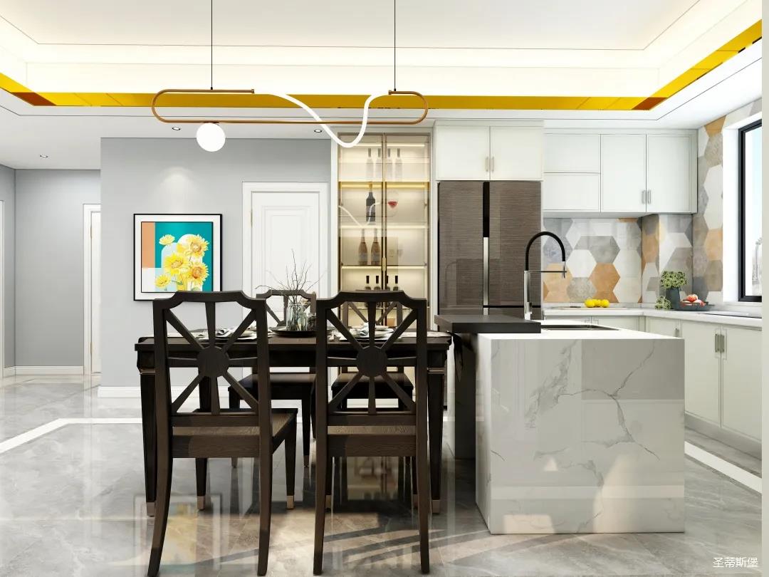 儀式感的餐廚空間,應(yīng)在自然光影中跳躍。從設(shè)計(jì)搭配細(xì)節(jié)將美式開放,不設(shè)限的特性顯現(xiàn),實(shí)木餐桌線條簡約且剛毅,中島臺(tái)鏈接起用餐空間的隨性,不遺余力的拉伸空間的層次感。