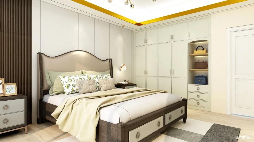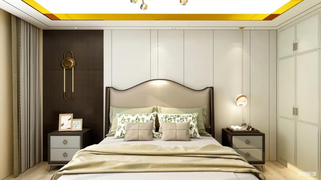 簡約象牙白木飾面與棕色線性條紋木飾面等比劃分,從色彩裝飾上瓜分整個(gè)臥室空間,一面簡約雅致,一面低調(diào)奢美。
