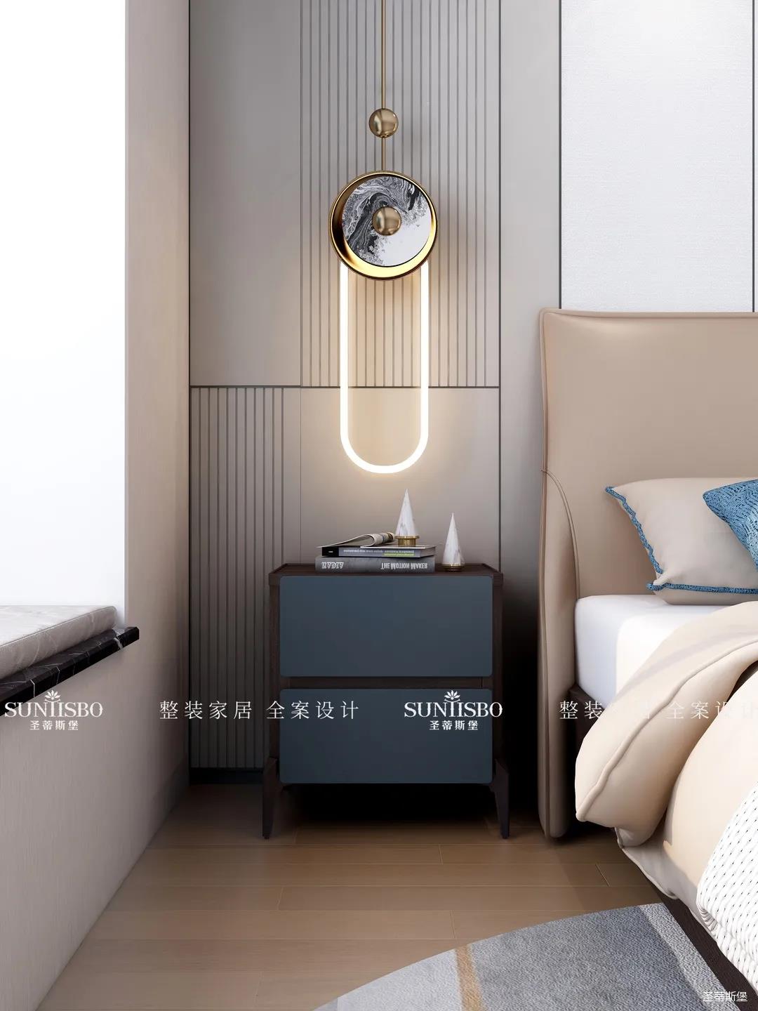 臥室把自然光線納入空間。穩(wěn)重的淺咖色床屏搭配柔和的灰白護墻,渲染了空間去繁從簡的設計。品質(zhì)精致的床品面料觸感自然柔軟,真皮質(zhì)地的家具匹配空間氣質(zhì),為業(yè)主營造了舒適愜意的休憩空間。