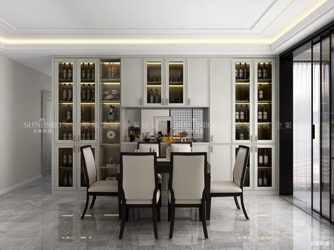 餐廳和客廳以大橫廳的形式展開(kāi),設(shè)計(jì)師將實(shí)木、玻璃、皮質(zhì)、金屬等看似相互排斥的元素相互重組,讓餐廳呈現(xiàn)多元式的輕奢氛圍。深淺色彩,對(duì)稱型的定制柜,都讓空間形成強(qiáng)有力的質(zhì)感對(duì)比。無(wú)論是午餐窗外的車水馬龍,還是晚宴的點(diǎn)點(diǎn)繁星,都能給屋主帶來(lái)良好的就餐體驗(yàn)。