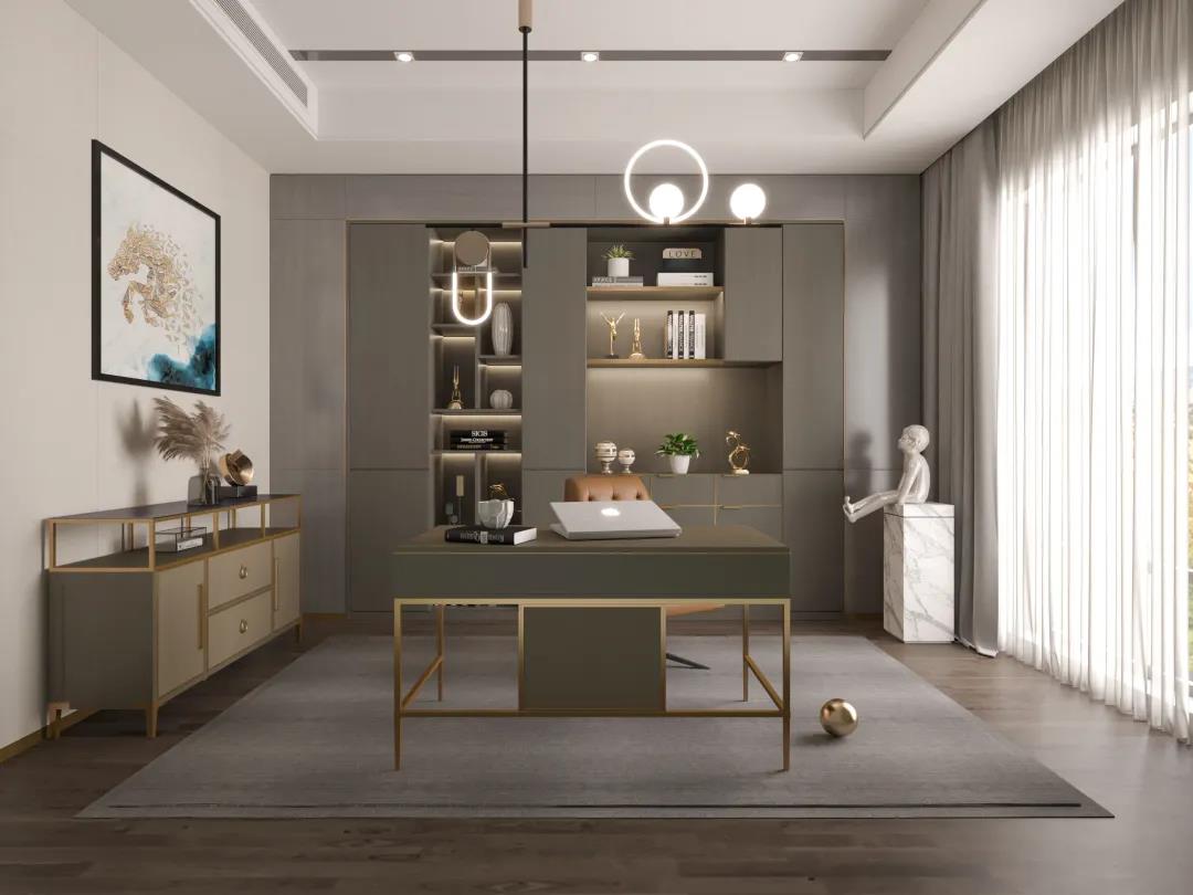 書(shū)房用現(xiàn)代手法定制了一個(gè)審美與意境并存的閱讀空間,極具生活儀式感。整體嵌入式書(shū)柜,用淺灰打底,深灰為框架,讓身心閱讀片刻沉浸。
