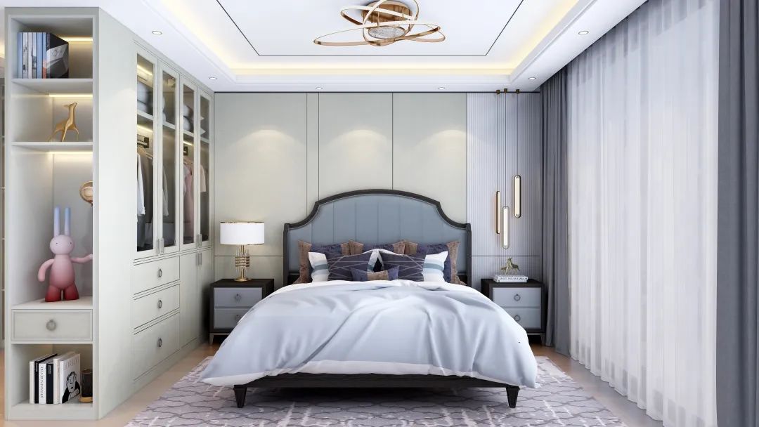 淡藍(lán)色也是冷靜色,可以使人更加容易入睡。床屏的邊緣采用了鉚釘鑲嵌,在光線照射下可提亮空間,使床屏看起來更加精致,更有輕奢的高級(jí)感。
